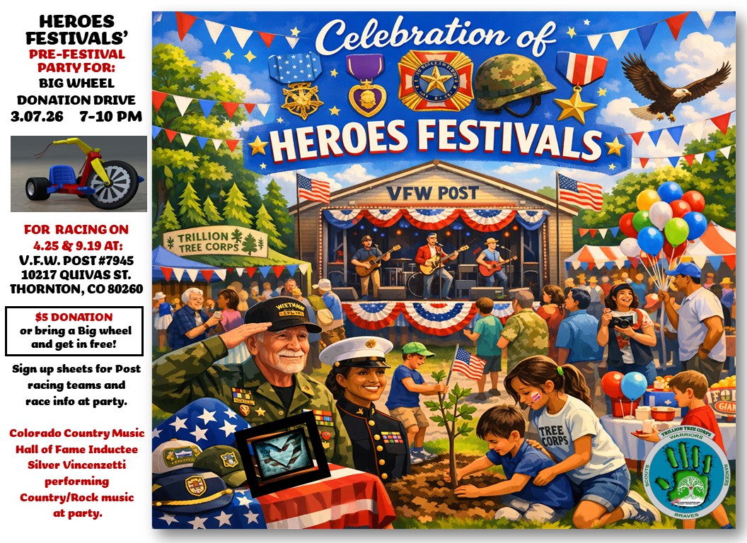 HEROES FESTIVALS 2026: Celebrating Colorado Veteran, First Responder, and Native American Heroes from over 30 V.F.W. and American Legion Posts across the Denver Metro area. Come join us on 4/25, 8/29, and 9/19 for Live Music, Food, and fun featuring Big Wheel Racing, Horseshoe and Cornhole tournaments, Forestry, Gardening, and BONSAI classes and workshops, and Veteran related booths. We will also be broadcasting live on our Warrior Assist Network featuring live interviews with the honorees. he events cost $20 with all proceeds going to the hosting Posts.